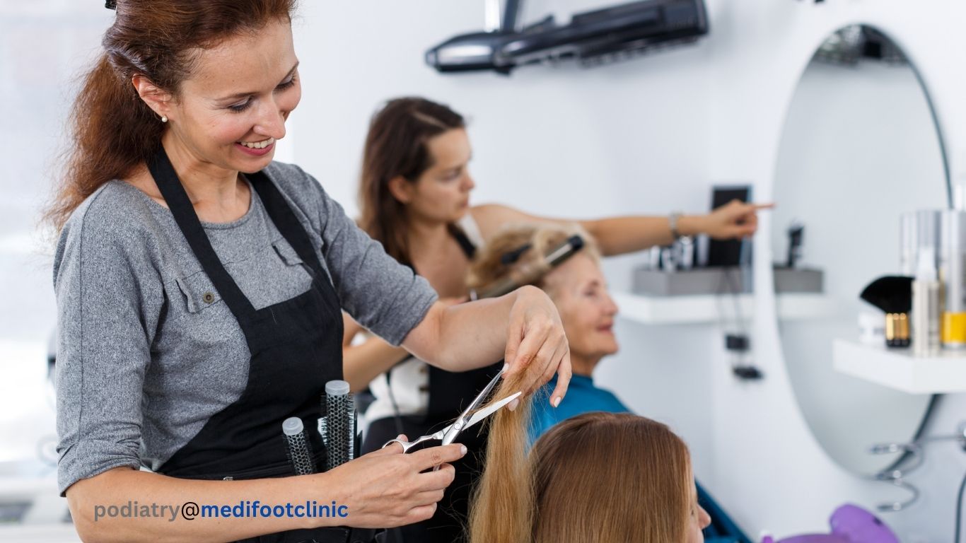 The salon environment is deceptively demanding on the feet. While the pace is different from hospitality or warehouse work, the sustained static standing beside the chair — combined with the lean and reach required during cutting, colouring and blow-drying — creates consistent and concentrated load on the feet throughout the day. Common contributing factors include: